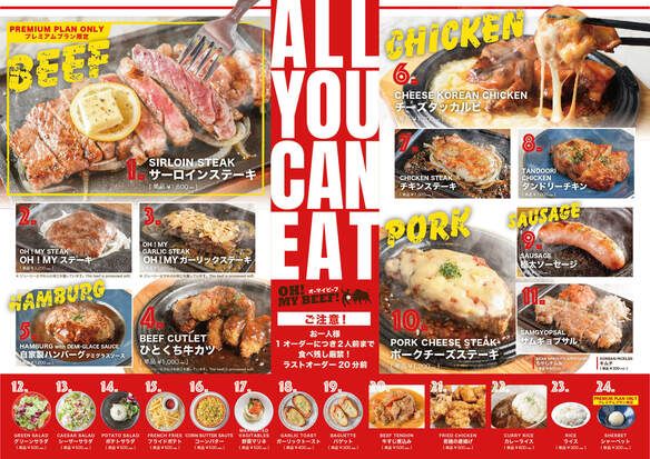 目の前で塊ステーキが燃え上がる!名物≪ファイヤーステーキ≫が食べられるプレミアムプラン! ☆まず最初にファイヤーステーキをお持ちします。 ※プレミアムプランのみの限定メニュー ※初回のみのご提供 ※お一人様200g×人数分のご提供(写真は4名様分) ★ステーキの王様サーロインステーキも食べ放題! ※未就学児:無料 ※小学生:年齢×100円(+税)