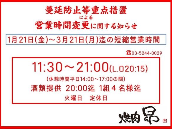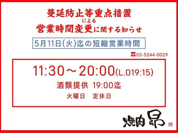 蔓延防止等重点措置に伴う営業時間変更のお知らせ