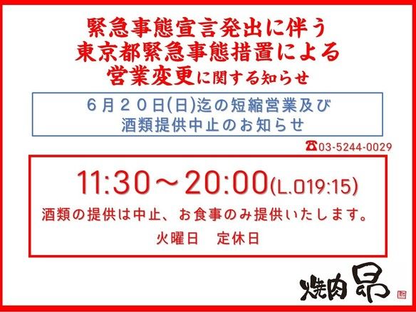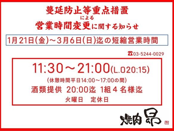 営業時間短縮及び酒類提供中止延期のお知らせ。