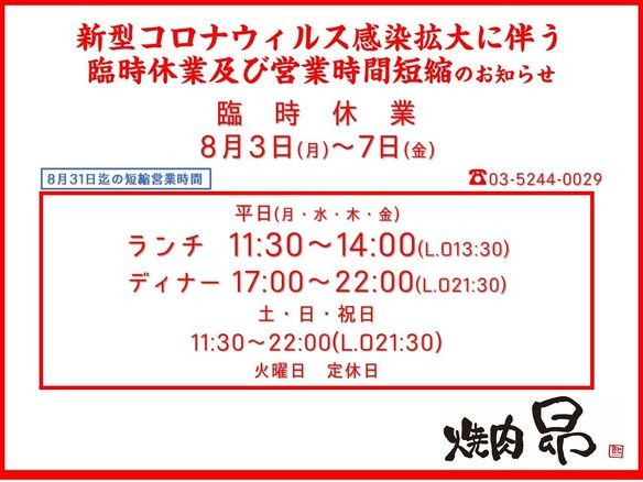 新型コロナウィルス感染拡大に伴い、臨時休業及び東京都の営業時間短縮要請に応え8月31日迄、営業時間を短縮いたします。
