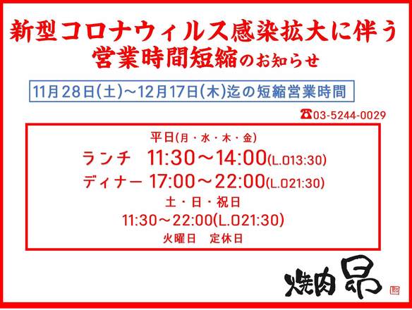 新型コロナウィルス感染拡大に伴い、東京都の営業時間短縮要請に応え12月17日(木)迄、営業時間を午後10時迄に短縮いたします。