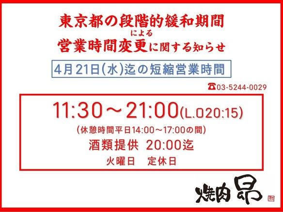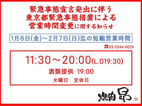 緊急事態宣言発出に伴う、東京都緊急事態措置による営業時間変更に関するお知らせ