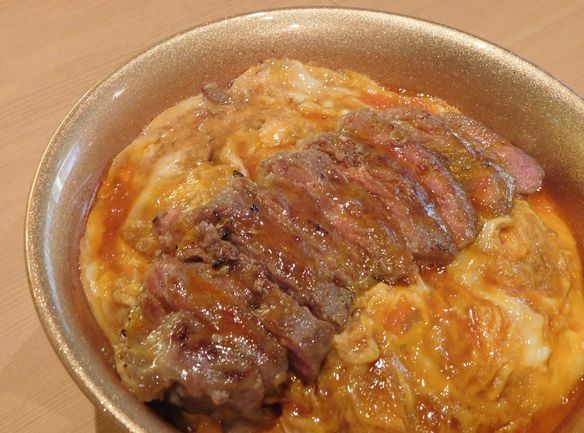厳選、牛ステーキをこだわりの玉子でとじた、「 開化丼 」です。 (お吸い物・香の物付き・内税) 1000円 是非ご賞味ください。