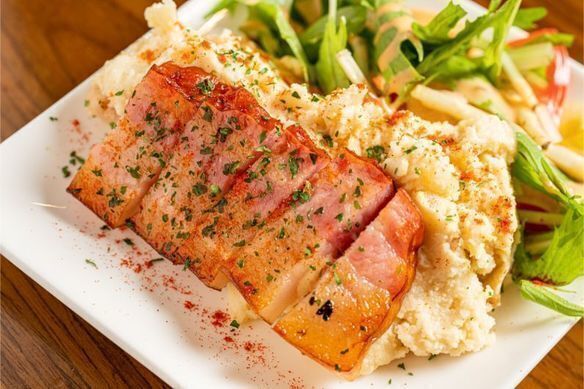ガツンとにんにくの効いたマッシュポテトと厚切りに切ったベーコンのハーモニー