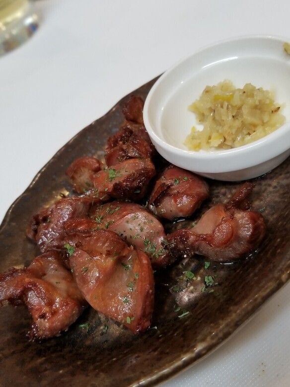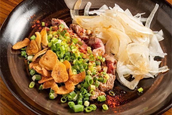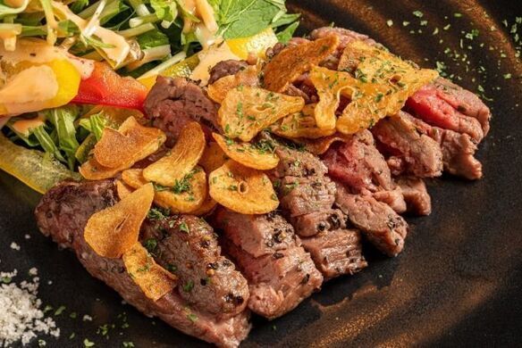 しっかりとした赤身の旨味を感じられるステーキは、分厚くカットされており食べごたえも抜群! カリッと揚がったガーリックチップがたっぷりとトッピングされていてビールもグイグイ進みます。 ステーキの肉は塊の状態で仕入れています。美味しい赤身を食べてもらいたいという思いから、肉に精通した店主自らが筋や脂身を丁寧に取り除くこだわりようです。