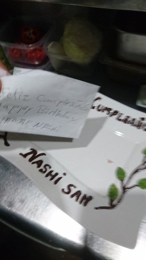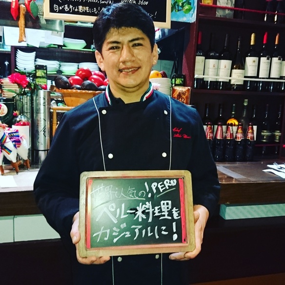 お店のキャッチコピーを黒板に書くスタイルなのですが、いろいろ迷って「ペルー料理をカジュアルに」という一言に。もちろん、店主のアルドさんに持ってもらいました!