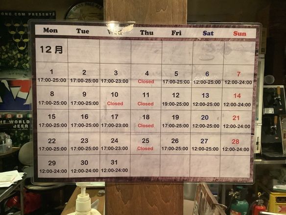 12:00〜20:00 ※緊急事態宣言につき、暫くの間は平日・土日祝ともに12時から20時までの営業となります。酒類の提供は19時までです。尚、テイクアウト及びUberEatsは22時までご注文可能です。 ※2/9(火)までは月曜日は営業、火曜日が定休日となります。 |