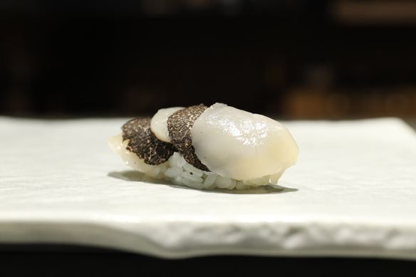 鼻腔をくすぐるトリュフの芳しい香りと帆立の甘味のバランスが最高な寿司です。