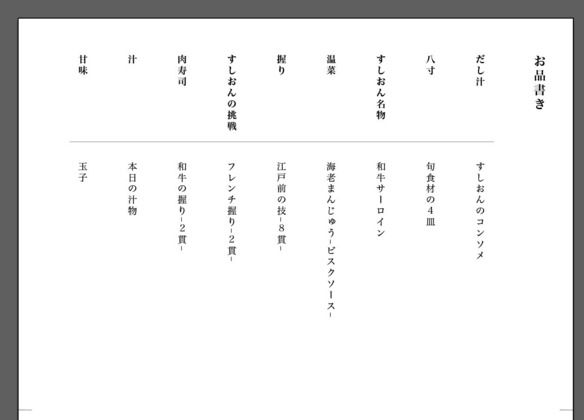 | 店名 | すしおん 表参道 ※現在八重洲(221 TOKYO)にて臨時営業中 |