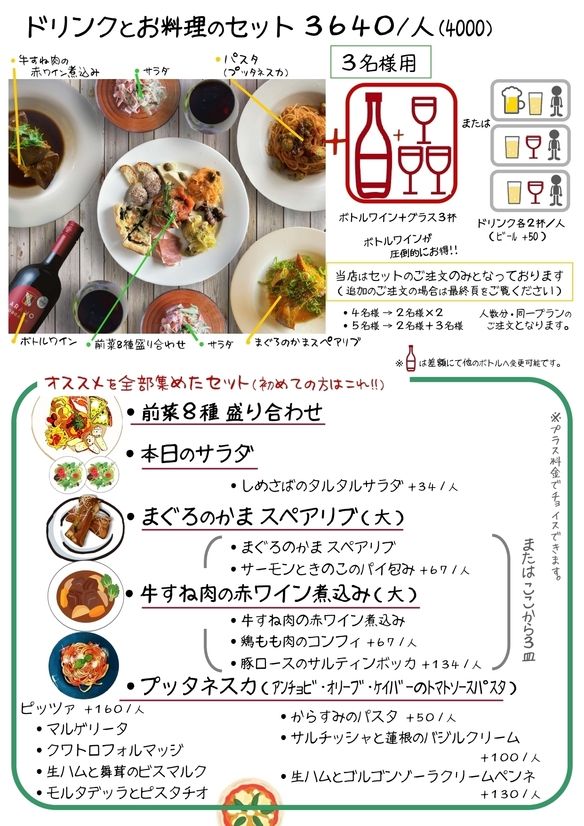 かねてから「オススメは?」と聞かれてお答していたものを全部集めて ドリンク付きセットにしました。 4名様:2名様×2 6名様:3名様×2 5名様:2名様+3名様 7名様以上:要 事前ご予約 人数分・同一プランのご注文になります。