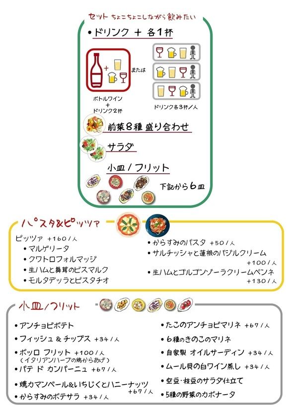 そんなピザやパスタみたいにガッツリいらない。 ただ、ちょこちょこ食べながらゆっくり飲みたい。。。 そんなご要望にお応えしたセットです。 もちろん気が向けば後でピザやパエリア・・なんて手もあります。 4名様:2名様×2 6名様:3名様×2 5名様:2名様+3名様 7名様以上:要 事前ご予約 人数分・同一プランのご注文とさせていただきます
