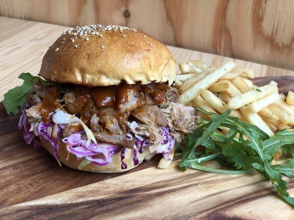 豚肩ロースを数種類のスパイスで1日マリネし、ゆっくりオーブンで1日しっとりジューシに、手間隙を掛けホークで簡単に引き裂けるめで柔らかく焼き上げます。この引き裂く仕草から「プルド」と言われています。クセになるコールスローのアクセント西洋山葵が豚の味わいを整え、特製スモークド BBQソースの甘みと薫香がバーガーにベストマッチ!!一度ご賞味下さい。
