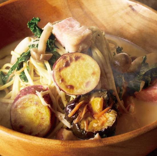 焼き芋と厚切りベーコンの旨味が溢れる、野菜たっぷりのスープパスタです。