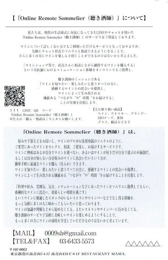 ~取引業者さんのご紹介です ホームページをご覧になっていただき、 気になるアイテムがございましたらご連絡ください 価格はMAMA.特別価格にてお見積りさせていただきます HATTA WINE https://hatta-wine.com/ 主な商品 Philippe Michel Crémant du Jura Brut NV クレマン デュ ジュラ フィリップ ミッシェル シャルドネ ブリュット NV P. Lancelot-Royer Champagne Cuvée Dualissime Extra Brut Blanc de Blancs NV シャンパーニュ キュヴェ デュアリシメ エクストラ ブリュット ブラン ド ブラン NV Gimonnet Gonet L'Origine Blanc De Blancs Champagne Grand Cru 'Le Mesnil-Sur-Oger' NV シャンパーニュ ロリジン ブラン ド ブラン グラン クリュ ブリュット NV Tarlant Reserve Brut ChampagneNV シャンパーニュ レゼルヴ ブリュット NV Anne Gros Cremant de Bourgogne La Fun en Bulles Brut NV クレマン ド ブルゴーニュ ブリュット NV Lucien Boillot & Fils Puligny-Montrachet 1er Cru 'Les Perrières' 2018 ピュリニイ モンラッシェ プルミエ クリュ "レ ペリエール" 2018 Philippe et Vincent Lécheneaut Bourgogne Hautes Côtes de Nuits Blanc 2019 ブルゴーニュ オートコート ド ニュイ ブラン 2019 Domaine Gros Frère Et Soeur Bourgogne Hautes Côtes De Nuits Blanc 2019 ブルゴーニュ オート コート ド ニュイ ブラン 2019 Domaine Boussey Monthelie Blanc 2019 モンテリー ブラン 2019 Charly Nicolle Chablis Grand Cru ”Bougros” 2019 シャブリ グラン クリュ ブーグロ 2019 Auvigue Cuvée Naturelle Pouilly-Fuissé" 2017 プイイ フュイッセ キュヴェ ナチュレル 2017 Château Haut-Bages Libéral La Chapelle de Haut Bages Liberal 2016 ラ シャペル ド オー バージュ リベラル 2016 Romain Duvernay Côtes-Du-Rhône-Villages 'Plan De Dieu' 2018 コート デュ ローヌ ヴィラージュ プラン ド デュー ビオ 2018 Pierre Chavin IGP Vaucluse Grenache-Syrah Vallis Terra 2019 IGP ヴォークリューズ グルナッシュ シラー ヴァリス テラ 2019 Domaine Alain Michelot Morey Saint Denis 2018 モレ サン ドニ 2018 Lucien Boillot & Fils Gevrey-Chambertin 1er Cru 'Les Corbeaux' 2019 ジュヴレイ シャンベルタン プルミエ クリュ "レ コルボー" 2019 Domaine Drouhin-Laroze Gevrey-Chambertin Sans Soufre 2019 ジュヴレイ シャンベルタン サン スフル 2019 Robert Groffier Les Hauts-Doix Chambolle-Musigny 1er Cru 2017 シャンボール ミュジニー 1er Cru "レ オードワ" 2017 Charles Francois & Fils Bourgogne Hautes Côtes de Beaune La Combotte 2019 ブルゴーニュ オートコート ド ボーヌ "ラ コンボット" 2019 Michel Gros Nuits-Saint-Georges 'Les Chaliots' 2019 ニュイ サン ジョルジュ "レ シャリオ" 2019 Château Boyrein Rouge AC. Graves 2016 シャトー ボアラン ルージュ AC グラーヴ 2016 La Millière Vieilles Vignes Châteauneuf-Du-Pape 2015 シャトーヌフ デュ パプ ヴィエイユ ヴィーニュ 2015 Kühling-Gillot Kreuz Spätburgunder 2017 クロイツ シュペートブルグンダー グローセス ゲヴェクス トロッケン 2017 Mont Tauch Les Garrigues Merlot 2018 ヴァン ド ペイ ドック メルロー レガリーグ 2018 その他もございます