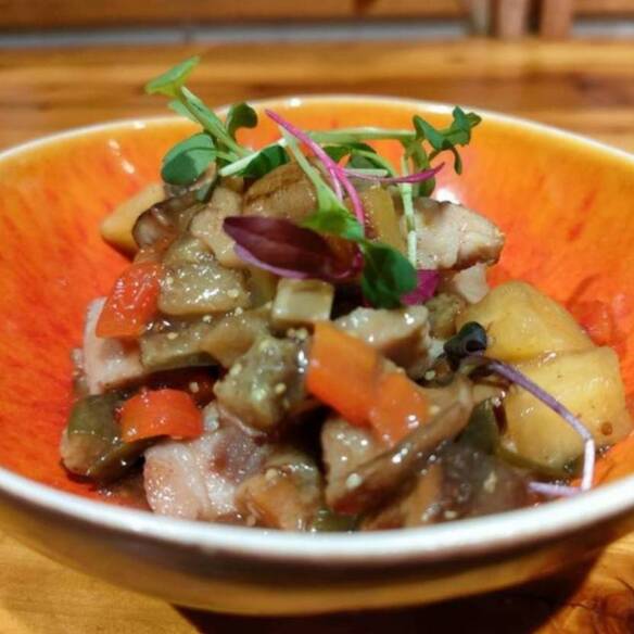 秋の味覚、薩摩芋の甘味、エリンギの歯ごたえ、茄子のとろみが、豚肉の旨味を引き立てます。山椒の香りがアクセントです。