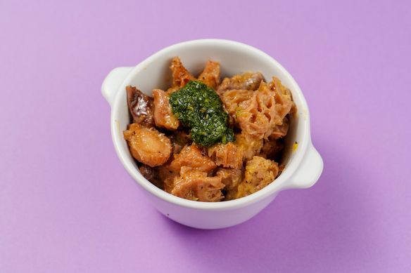 イタリア・フィレンツェの伝統料理「ランプレドット」に八丁味噌を加えモツの味噌煮込み風に