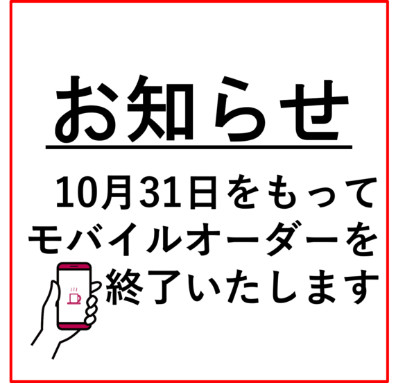 この度、ベックス四ツ谷店のモバイルオーダー実証実験を 10月31日をもって終了いたします。 近日中にモバイルオーダーをリニューアルし ご利用を再開いたしますため少々お待ちください。