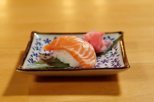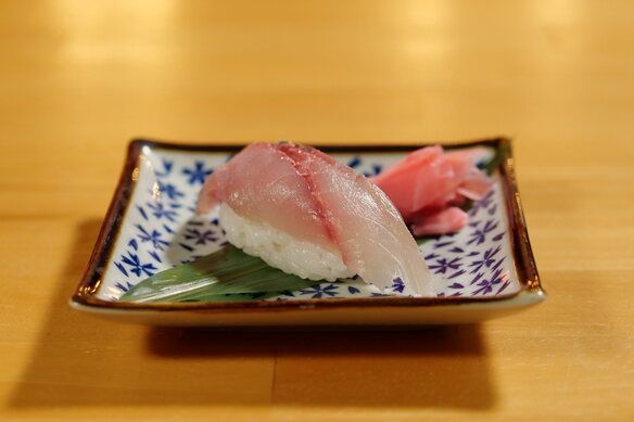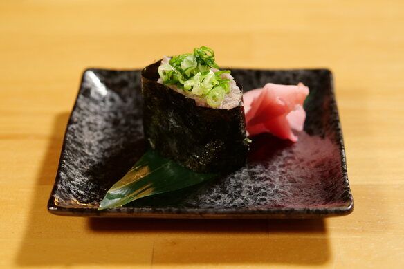 ネギトロと沢庵のハーモニーが絶妙な一品です。一皿6切れでの提供となります。