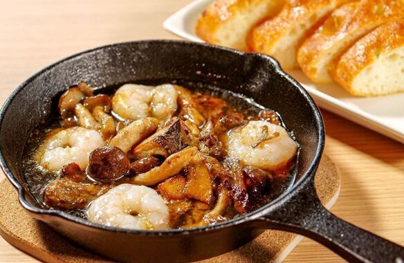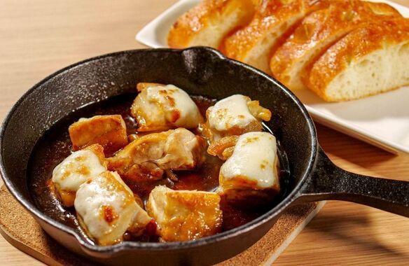 自家製のアヒージョソースです。フォカッチャを添えて提供いたします。