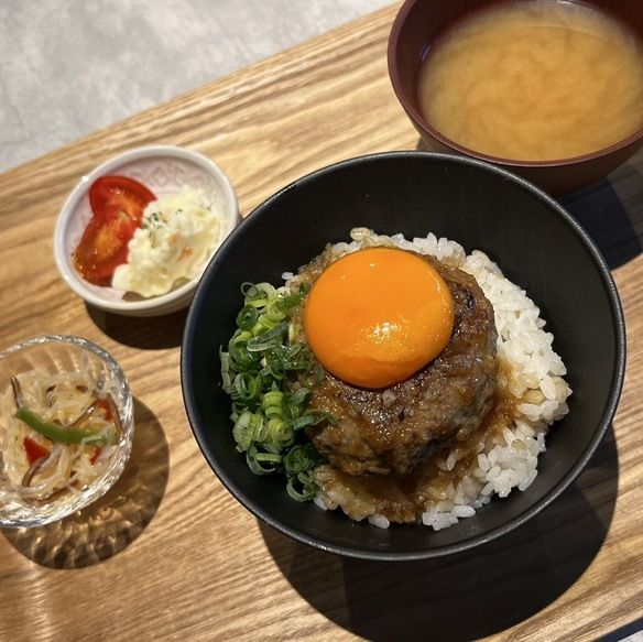 麦飯の上にグリルハンバーグと京たまごを乗せちゃいました♪ 九条ネギも!! 二種類のソースをお好みでお召し上がりください。