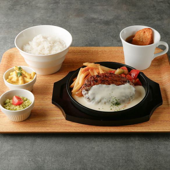 ライス、副菜2品、本日のスープがセットに、手ごねハンバーグと自家製のチーズソース!THE鉄板!