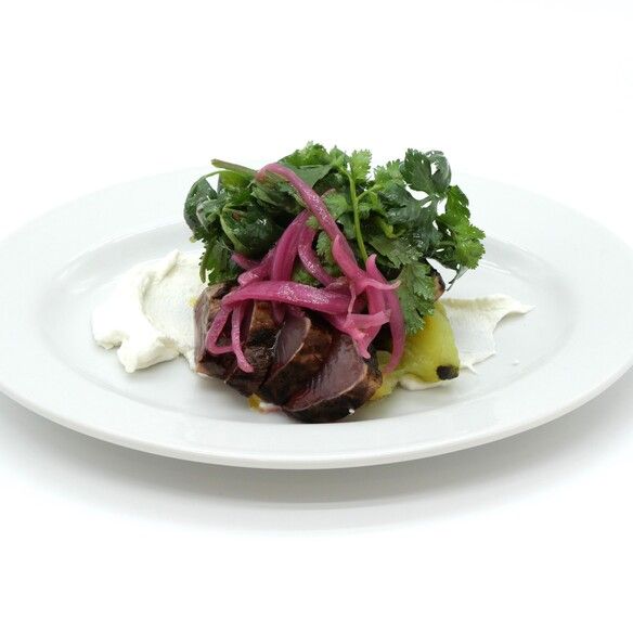 旬の初鰹のタタキと焼きナスをたっぷりのパクチーと