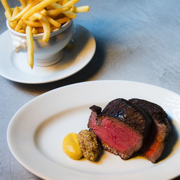 ビストロ定番の一皿 山盛りのフライドポテトと。火入れにお時間いただきます。