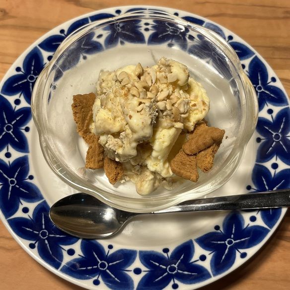 ハルバ(ゴマのお菓子)とアイスクリームをミックス ナッツとビスケットトッピング A mix sesame sweets and ice cream topped with nuts and biscuits