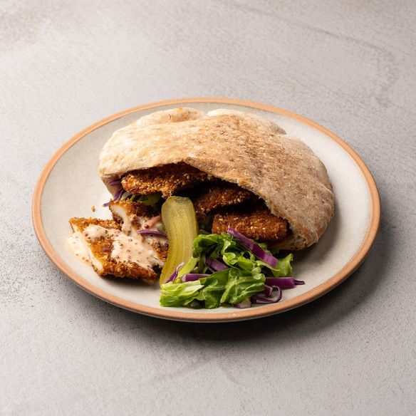 イスラエルパン粉をまぶしてささみのお肉をフライにしたシュニッツェル、フムス、サラダのピタサンドです