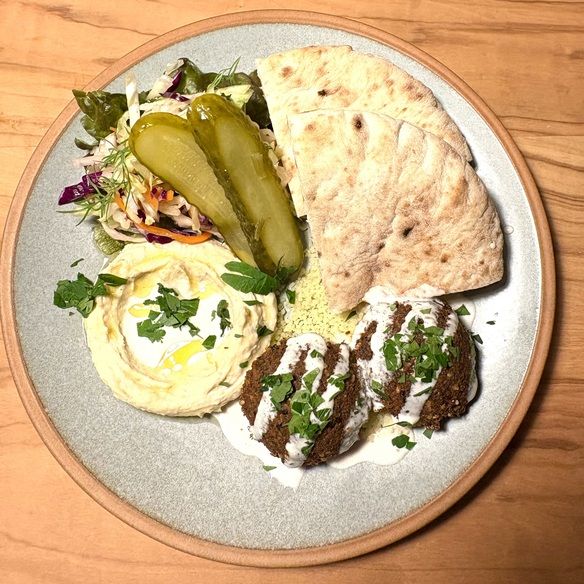 通常のファラフェルプレートの軽いランチ向けのミニプレートです 無添加の手作りファラフェル、フムス、サラダ、イスラエルフライドポテトのワンプレートです。