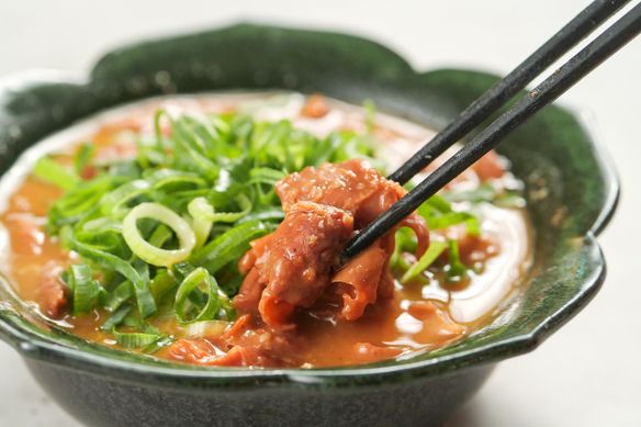 熊本産豚のホルモンを田舎味噌でじっくりと煮込みました。たっぷりのネギで。