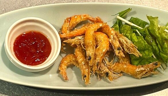 新鮮な川えびをカラッと揚げて、インドネシア風にサンバルソースを添えました。