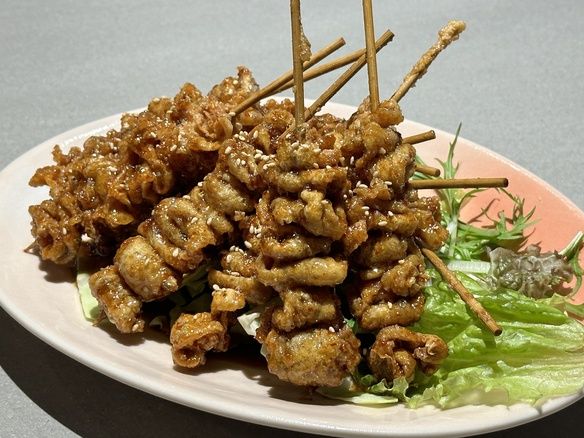 国産鶏の首皮をじっくりと揚げ、余分な水分を抜き、パリパリに仕上げてます。ピリ辛だれが味の決め手
