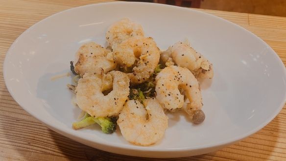 ニンニクと胡椒がきいた絶品おつまみ、ぷりぷりのエビがたまりません。