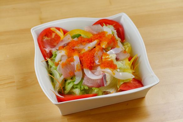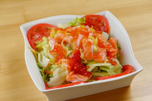 みんな大好きサーモンとイクラのサラダです!青じそドレッシングかゴマドレッシングをお選びいただきます。