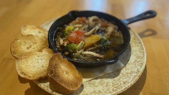 イカのゲソからでる旨みが野菜とオリーブオイルに溶け出したアツアツのアヒージョです!バケットを漬けるとおさけがとまりません!