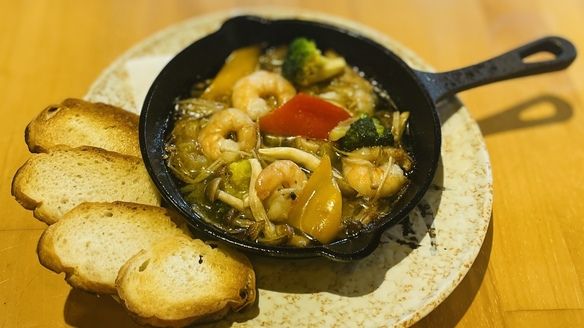 プリプリ海老と彩野菜のアツアツアヒージョです!サクサクバケットで美味しいオイルをお楽しみください。