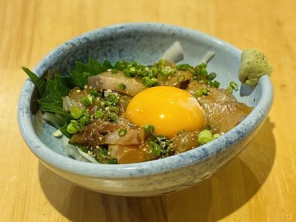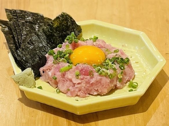 脂の乗った人気のネギトロをお月見仕立てに仕上げた定番つまみ! よくかき混ぜて海苔と一緒にどうぞ!!