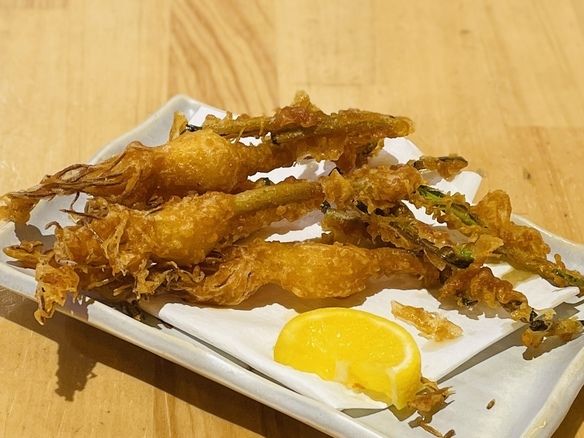 お酒のお供に嬉しい天ぷらシリーズのイカゲソの天ぷらです!サクサクと軽めの衣がビールとよく合います。