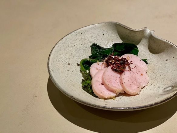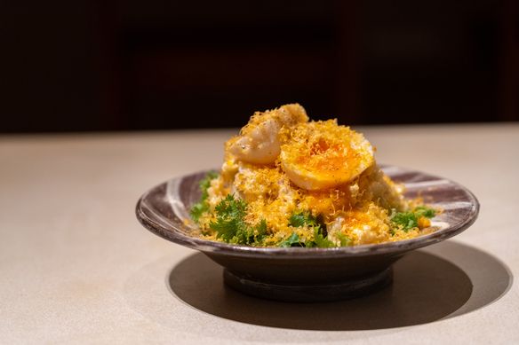 燻製ポテトサラダにカラスミパウダーとミモレットチーズをふんだんに削りました。