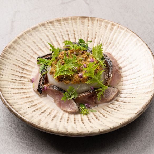 自家製のピスタチオ山椒味噌を添えたふろふき大根と炙りしめ鯖