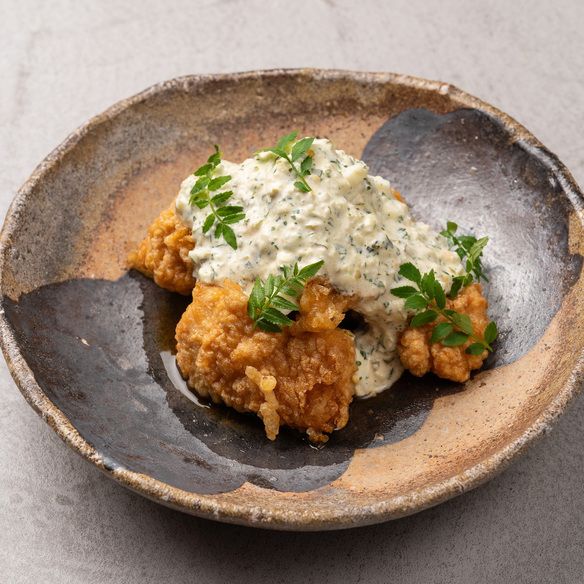 衣をつけて揚げた鴨もも肉を甘酢に浸し、刻んだ葉山椒を加えてタルタルソースをかけて一品