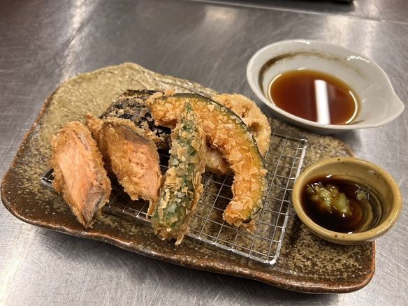 アジ、ナス、オクラ、カボチャ、レンコンの盛り合わせです。