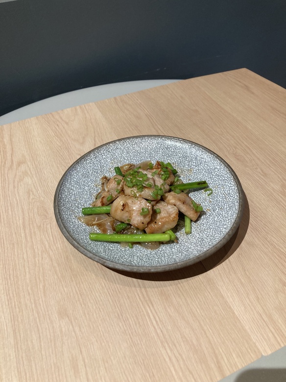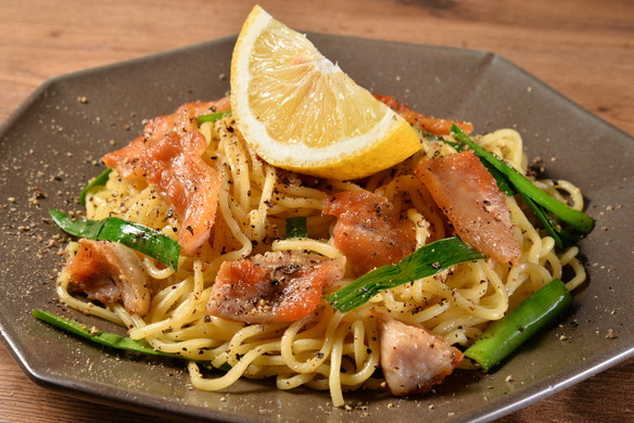 ジューシー豚トロと香り高いニンニク芽を、ブラックペッパーきいた塩だれで♪