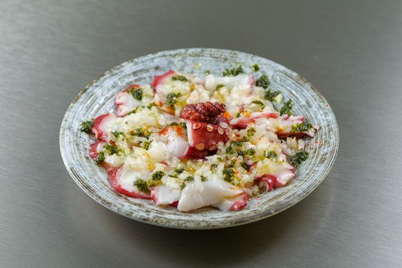 豊洲から仕入れた真蛸は新鮮そのもの!適度な弾力と歯ごたえで食べ応えのある一品に。特製のバジルビネガーソースとよく合います