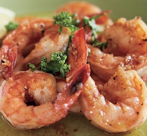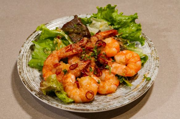 ガーリックとスパイスが効いたプリプリのエビ料理。香ばしいガーリックの香りとピリ辛スパイスが食欲をそそります。