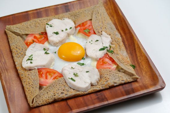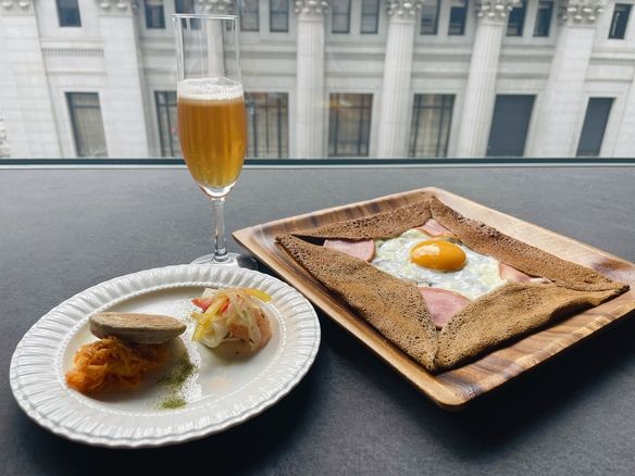 前菜2種、ガレット、シードルか紅茶のセットになります。 ガレットはコンプレ(ハム、卵、チーズ)、もしくはプーレ(鶏ムネ肉、トマト、卵、チーズ)よりお選びいただけます。