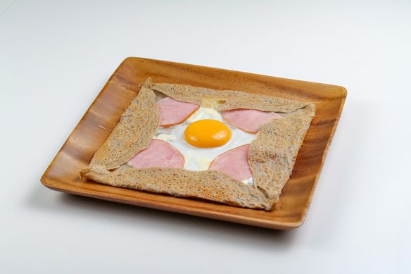 最もスタンダードなハム、チーズ、卵のガレットです。 トッピングする事も出来ます。