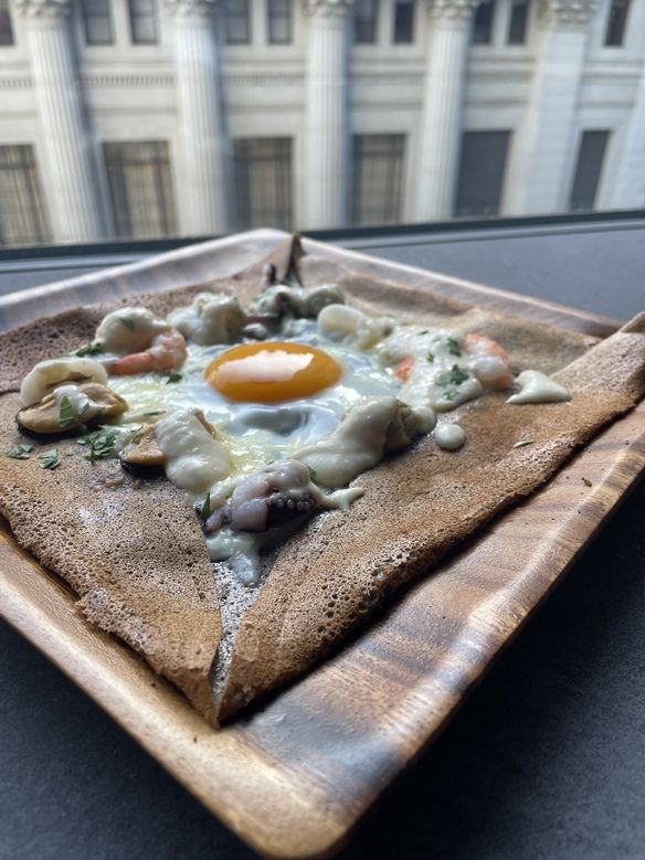 魚介類にノルマンディソース(シードルと魚介出汁のクリームソース)をかけたガレットになります。