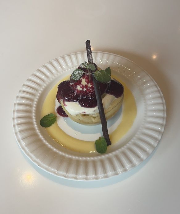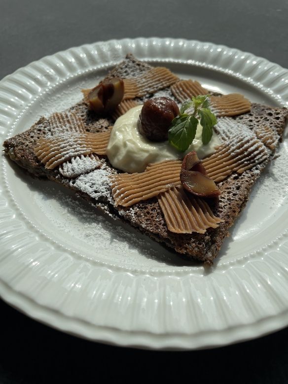 香ばしいガレットに濃厚なカルバドス風味のマロンクリームと渋皮栗を合わせました。 添えられたリンゴのコンポートとのマリアージュもお楽しみください。
